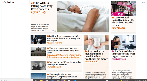 När man kommer till The Guardians startsida så hamnar man automatiskt i fliken News. När man skrollar sig neråt så finns det ämnesrubriker längst till vänster som visar vilken avdelning nyheterna tillhör. Under fliken News så finns till exempel avdelningarna Headlines, Spotlight och Coronavirus.