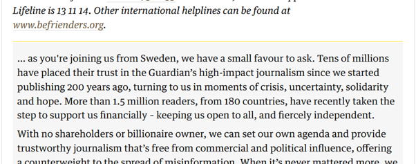Jag tycker att det är generöst att jag kan läsa så långa artiklar utan att vara prenumerant eller ens skapa gratiskonto så jag har förståelse för att det blir en del uppmaningar att skänka bidrag eller börja prenumerera.